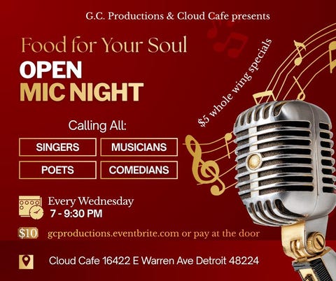 Leave your stress at the door! Get ready for an evening full of great vibes & awesome performances at the Food for Your Soul Open Mic series! This event is all about showcasing your talent, whether you are a poet, musician, comedian or just want to come enjoy the arts. Cloud Cafe is where you want to be every Wednesday night! Bring your friends, grab a bite, & nourish your spirit with some incredible local talent. Don’t miss out on the fun & good energy – it’s the perfect way to feed your soul!