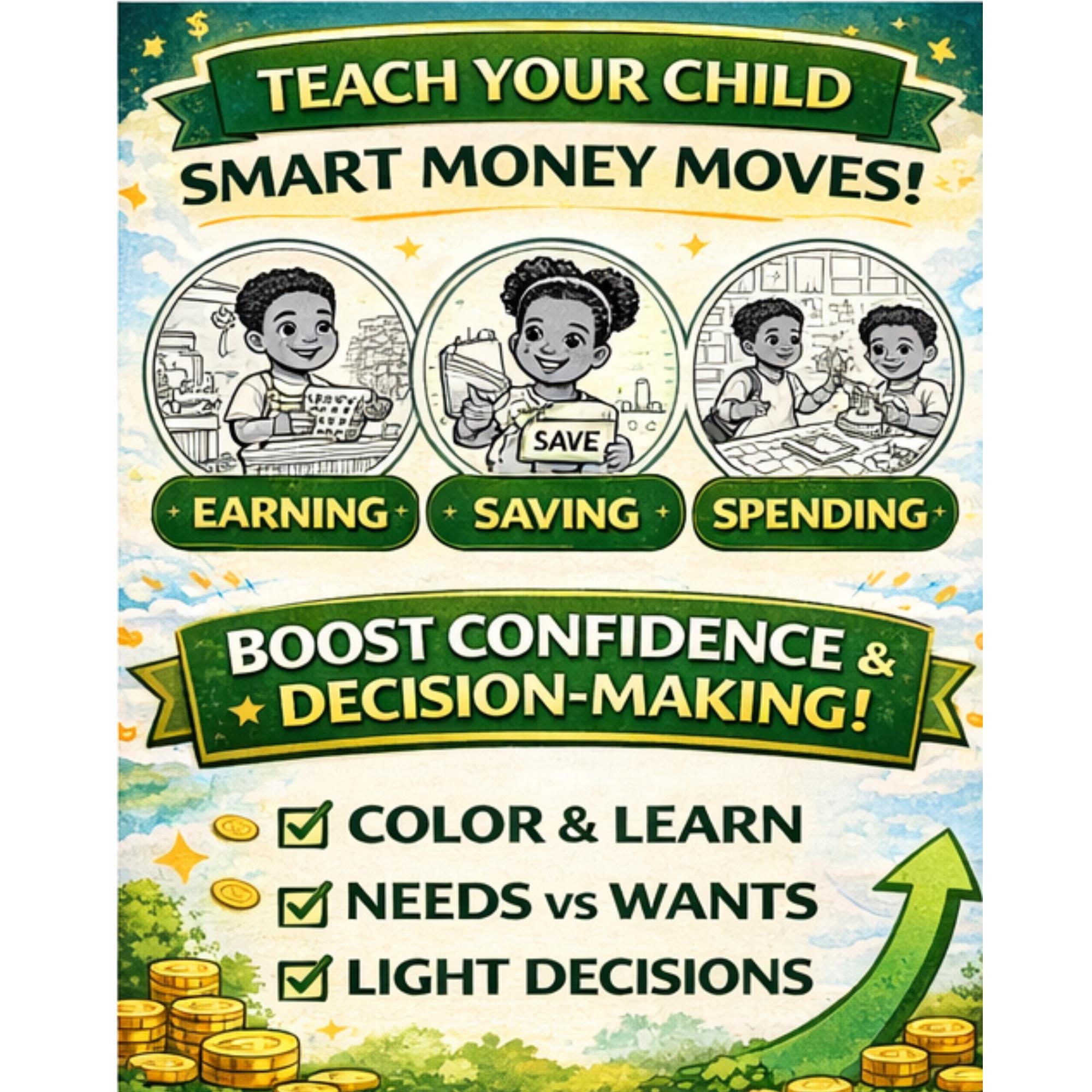 This engaging book introduces foundational money concepts in a simple, visual, and interactive way. Children will explore how to earn, save, spend, and make smart choices through coloring pages, activities, and real-life scenarios they can understand.
